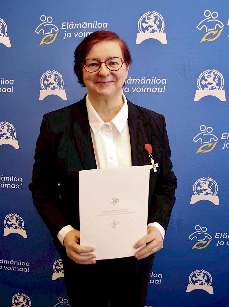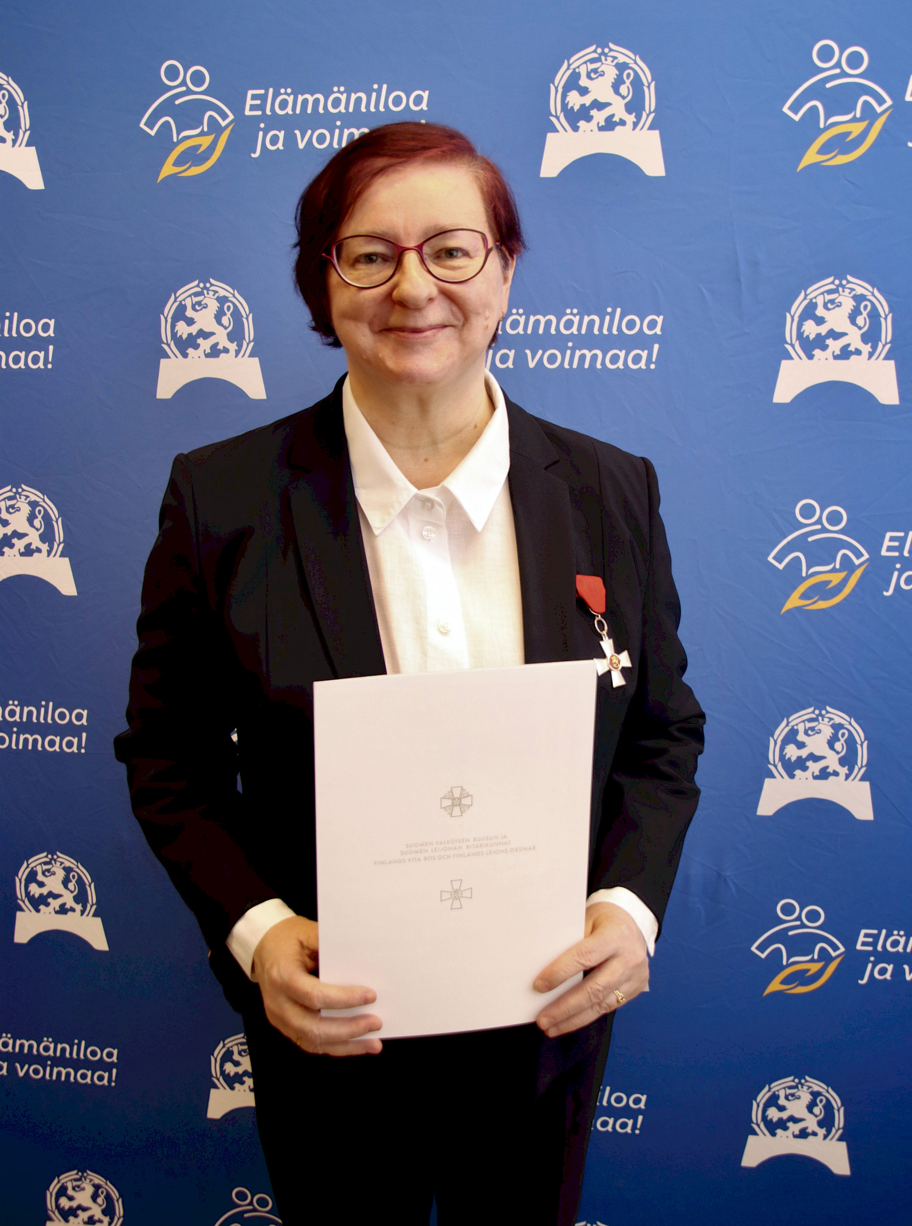 Senioriliiton järjestöpäällikkö Pia Nymanille annettiin Suomen Leijonan ritarikunnan ansioristi itsenäisyyspäivänä 2024.