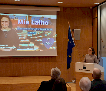 Lisäksi keskusteltiin senioriliiton omasta edunvalvontatyöstä. Senioriliitto tekee edunvalvontatyötä valtakunnallisesti ja Euroopan tasolla ESUssa. Edunvalvonnasta Euroopassa kertoi valtuustomme puheenjohtaja, ESUn varapuheenjohtajistoon kuuluva Leena Jääskeläinen sekä liittohallituksemme jäsen Olavi Nieminen.