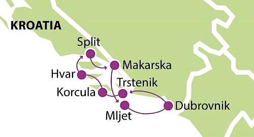 Viikon aikana pääset Splitin ja Makarskan mukulakivikujille ja suojellulle Mljet-saarelle sekä Dubrovnikiin – se on rannikon uljaimpia näkyjä mahtavine muureineen, palatseineen ja luostareineen. Saaret ovat toinen toistaan houkuttelevampia. Rauhaisan Korčulan kruunaa idyllinen vanhakaupunki. Tyylikäs Hvar kelpaa kansainväliselle jetsetillekin. Päivisin saat nauttia alati vaihtuvista maisemista, nähtävyyksistä ja laivan puolihoidosta. Kristallinkirkas meri kutsuu uimaan. Iltaisin on aikaa käyskennellä ostoskaduilla ja ruokailla tunnelmallisissa rantaravintoloissa – joka ilta olet jossakin uudessa kiehtovassa paikassa. Voi miten mukavaa lomaa ihastuttavissa Kroatian saaristomaisemissa!