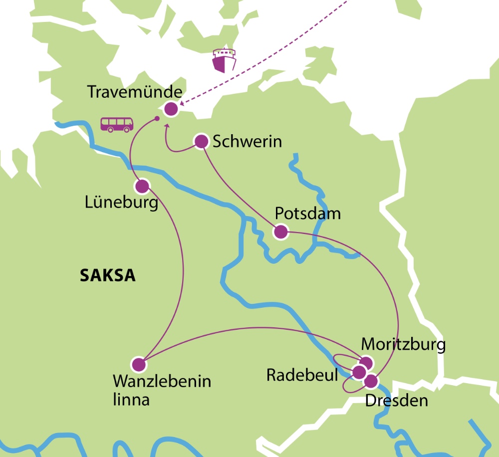 Kohteina Lüneburg, Moritzburg, Radebeul, Dresden, Potsdam ja Schwerin