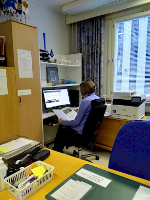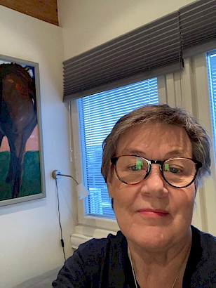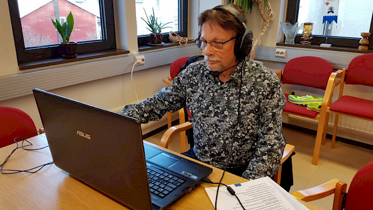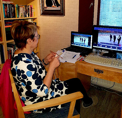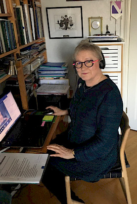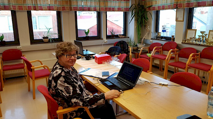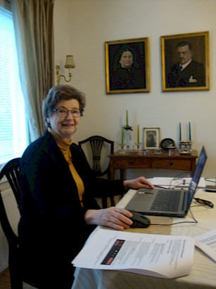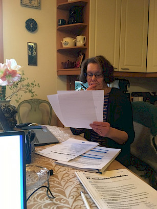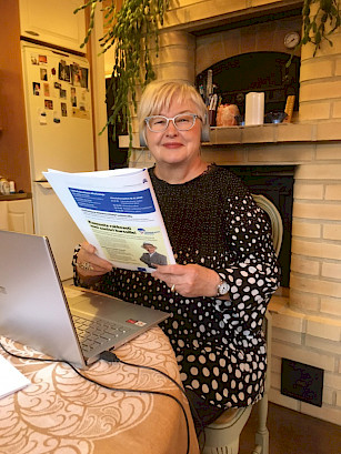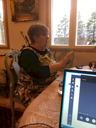 Tampereen kansalliset seniorit ry:n toimistolla kuuntelemassa liiton tulevan toiminnan ja talouden suuntaviivoja 27. liittokokouksessa etäyhteydellä. Hilkka Kallio.