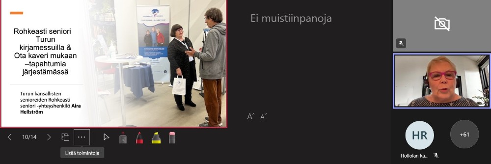 Vaikka Rohkeasti seniori -hankkeen toiminta nykymuodossaan loppuu rahoituksen päättymisen kevätkauden lopulla, jatkavat hankkeemme vapaaehtoiset matalan kynnyksen työn toteuttamista piireissä ja paikallisyhdistyksissä eri puolilla Suomea. Koulutuspäiväämme osallistui miltei 70 etukäteen ilmoittautunutta osanottajaa yhdistyksistä Helsingistä Lappiin saakka.