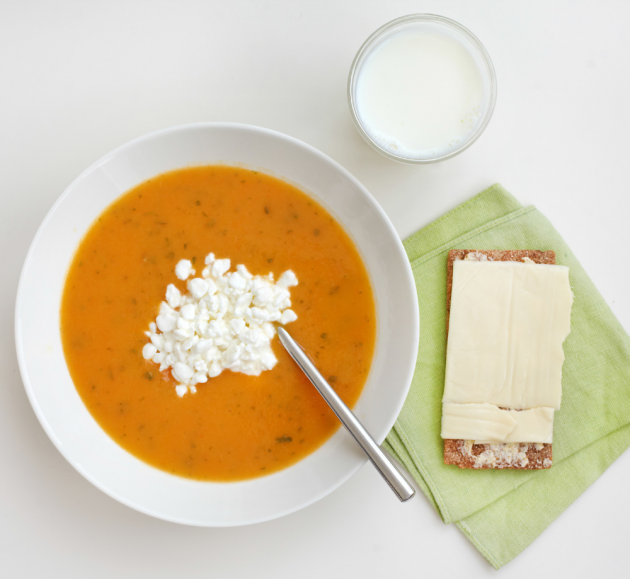 Esimerkiksi raejuusto on helppo proteiinilisä kasvissosekeitossa.