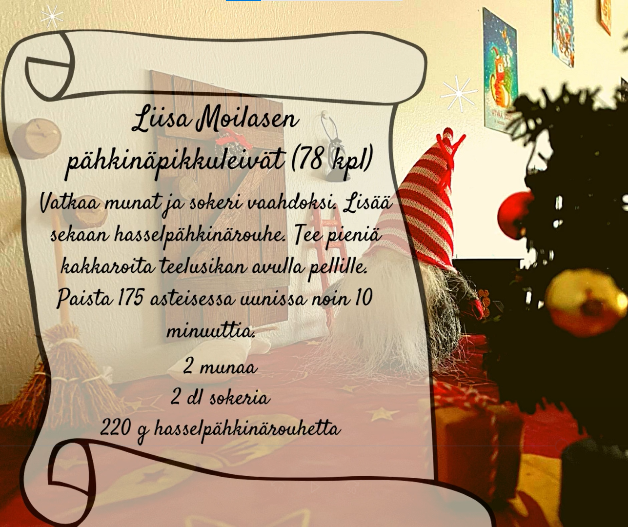 Ensimmäisestä joulukalenterimme luukusta paljastuu herkullinen pähkinäpikkuleipien resepti, jonka on hankkeellemme kertonut senioriaktiivi Liisa Moilanen Laukaan senioreista.