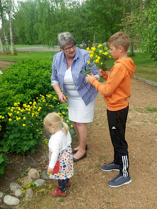 Pohjanmaan kansallisen senioripiirin puheenjohtajan Taija Hakolan lapsenlapset Niko, 11, ja Emmi, 2, ovat mummin kanssa keräämässä kukkia vietäväksi papan haudalle.