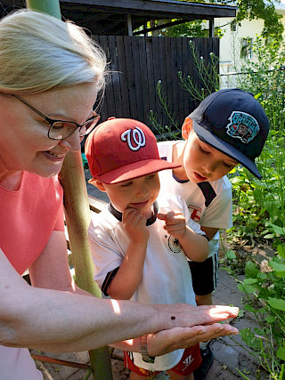 Yllä olevassa kuvassa Paula Kemppainen on lastenlastensa kanssa tutkimassa leppäkerttua. Kuvan otti hänen miniänsä Carolina Wikström.