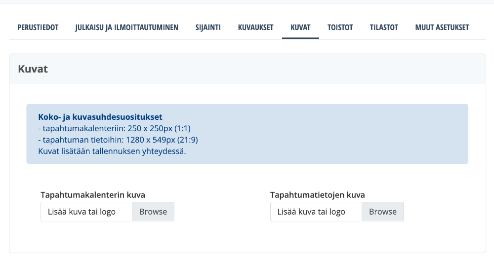 - Lisää haluamasi kuva TAPAHTUMATIETOJEN KUVA -kohtaan, jotta se siirtyy oikein tapahtumakalenteriin. Huomioithan että viive kuvan tulemisessa näkyviin on noin 15 minuuttia tallentamisesta. Huomaa että kuvan koko tulee olla 1280 x 549px (21:9)