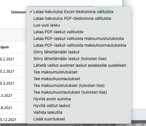 Myyntireskontrassa on myös mahdollista käsitellä yhdellä kertaa vaikka kaikki avoinna olevat laskut seuraavasti: