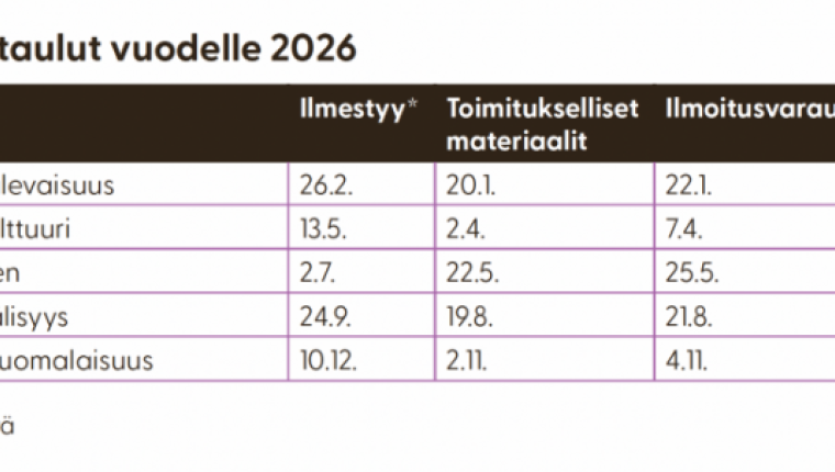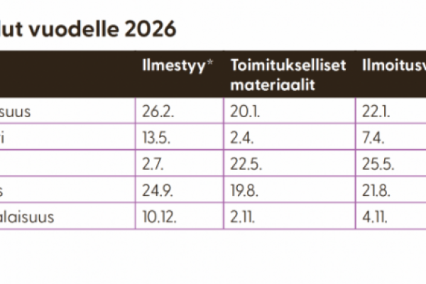 Artikkeleiden ja kuvien aineistopäivät 2026 sekä ohjeet lehden avustajille ja toimittajille