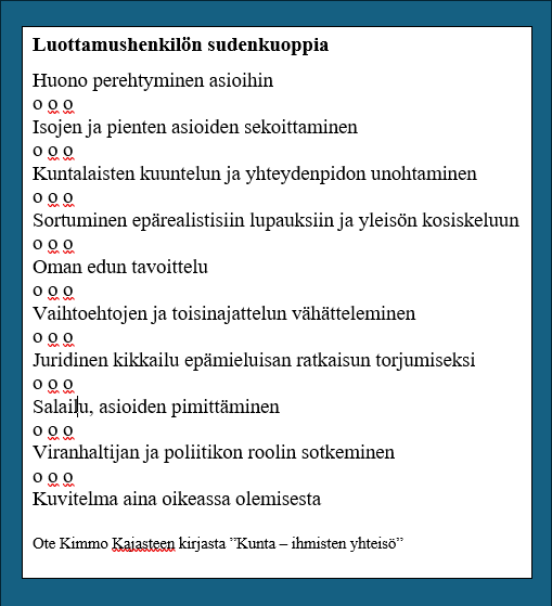 Hyvä ja tehtäväänsä vihkiytynyt valtuutettu perustaa toimintansa tietoon, on yhteistyöhakuinen ja yhteistyökykyinen, välittää kanssaihmisistä, on suvaitsevainen eikä ole itsekäs omien etujen ajaja, vaan haluaa edistää koko kunnan ja alueen asujaimiston hyvää – kuten lainsäädäntökin velvoittaa.
