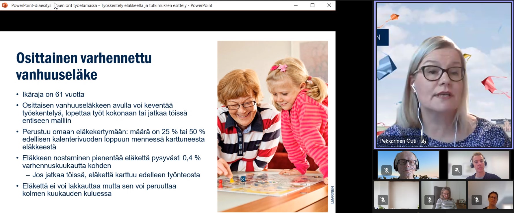 Paikalle Teamsissä järjestettyyn tilaisuuteen oli ilmoittautunut ennakkoon miltei 40 osanottajaa. Aiheesta kiinnostuneet osallistujat saivat osallistua Seniorit työelämässä -tilaisuuden kulkuun niin alun yhteisen esittäytymiskierroksen kuin puheenvuorojen lomassa esitettyjen kysymysten kautta. Osallistujia puhututtivat esimerkiksi tulevat lakimuutokset, ikääntymiseen suhtautuminen Suomessa kuin konkreettiset mahdollisuudet eläkkeellä työskentelyyn ja kokemukset siitä.