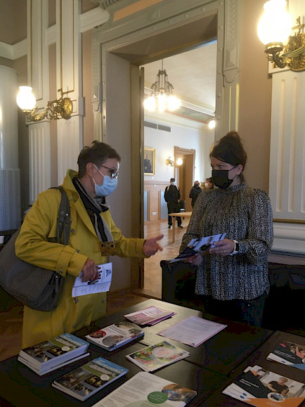 Kuvassa Outi Savonen esittelee kaupungin kulttuuripalveluita senioreille.